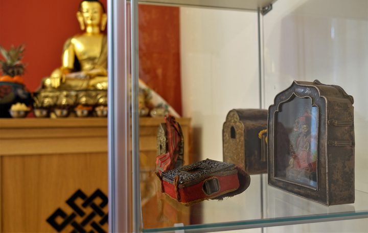 Die Tibethaus Kulturstiftung hat eine große Schenkung von wunderschönen Gaus (Reisealtäre) erhalten. Gaus aus Silber, Messing, aus bemaltem Holz, in denen Tsatsas, kleine Buddha-Statuen oder Fotos von verehrten Meister/innen bewahrt werden. In unserer aktuellen Ausstellung möchten wir sie der Öffentlichkeit vorstellen und Begeisterung erzeugen für diese vielfältigen Botschafter der tibetischen Kultur und Geisteshaltung.