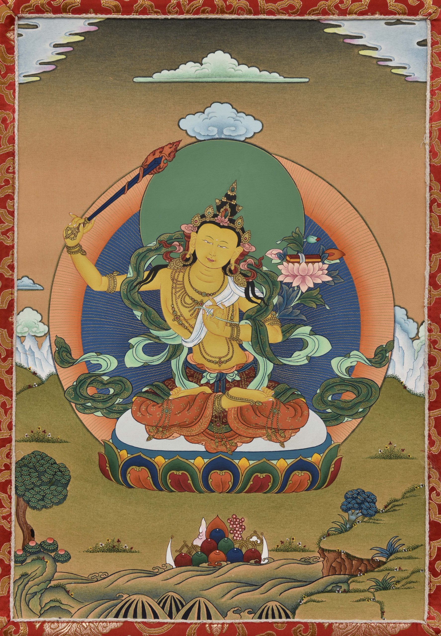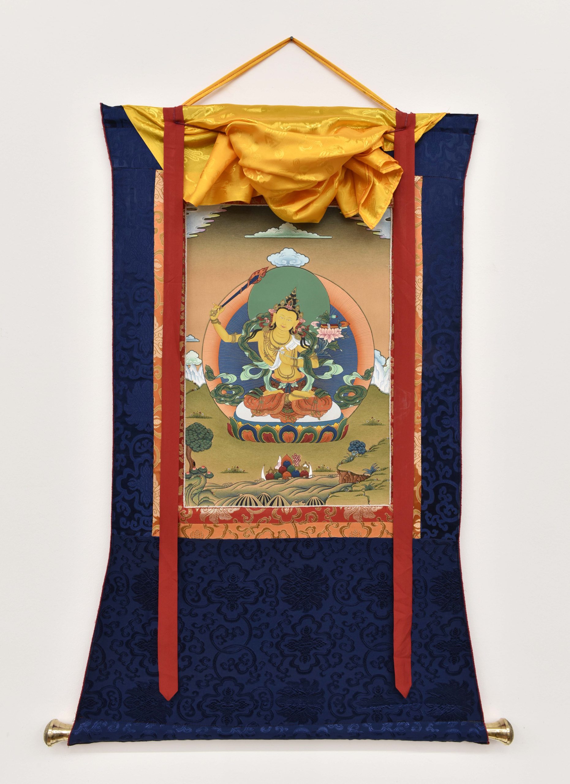 Thangka Manjushri, Bild 48 x 33 cm, eingenäht in Brokat 100 x 55 cm