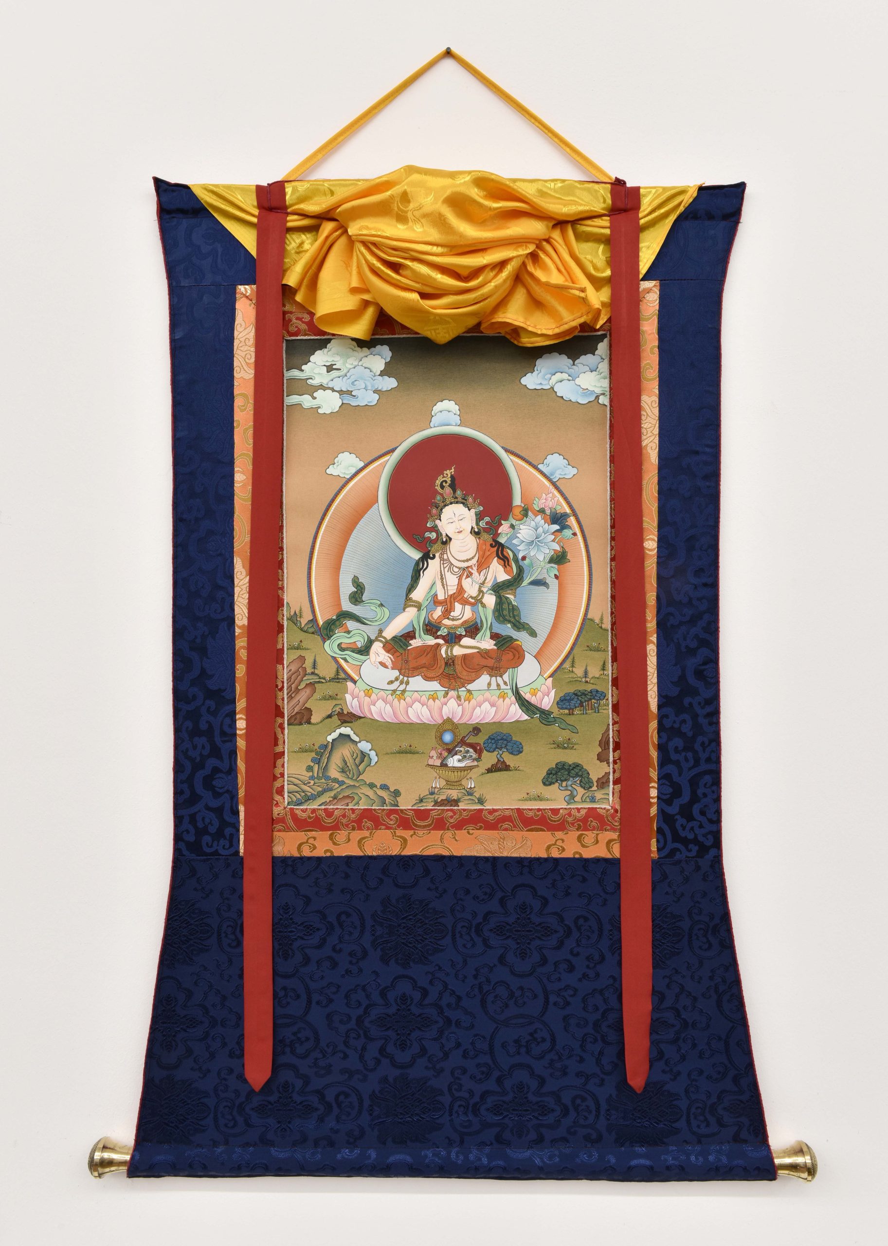 / Thangka Weiße Tara, Bild 48 x 33 cm, eingenäht in Brokat